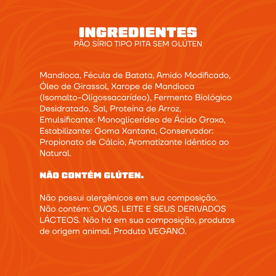 Mandioca, fécula de batata, amido modificado, óleo de girassol, xarope de mandioca, fermento biológico, sal, proteína de arroz, emulsificante (monoglicerídeo de ácido graxo), estabilizante (goma xantana), conservador (propionato de cálcio) e aromatizante. NÃO CONTÉM GLÚTEN. ALÉRGICOS: Não possui alergênicos em sua composição. Não contém: ovos, leite e seus derivados. Não há em sua composição produtos de origem animal. Produto vegano.